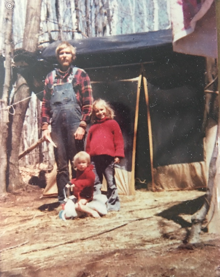 Within the next couple of weeks, the mom got her kitchen lean-to. Boards were planted in the earth and a plastic tarp was strung across the slanted roof. A high table was constructed for a countertop to make cutting vegetables and making salads easier. She was enthralled after having taken so much time and difficulty putting meals together whilst sitting on a log, balancing a cutting board on her knees. And when a small tractor was secured from a friend back in town and towed up to the land on a flatbed, it also tugged up the cast-iron cookstove which helped make cooking even easier in the lean-to. It eventually was moved to inside the cabin.
